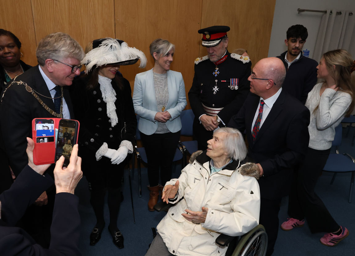 Photo: top, guests at the Holocaust Memorial Day Service; bottom, the Mayor, far left talks to Kitty Hart-Moxon, OBE, centre in wheelchair.
